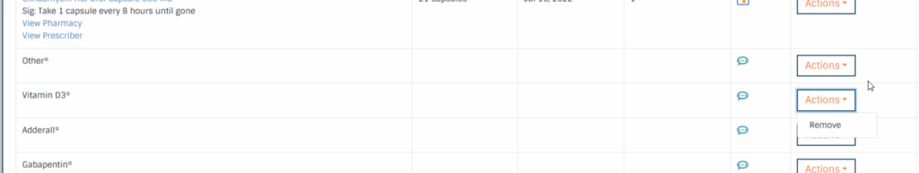 Find the medication you wish to remove, click on the Actions” button on the right, and select “Remove”