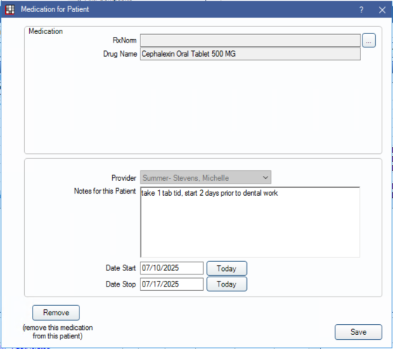 Go back to the chart in Open Dental, double click on the medication in the Patient Info box on the Chart tab